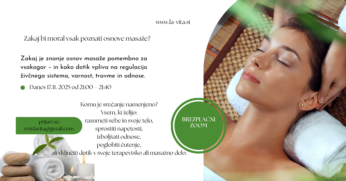 Danes, ob 21:00, poteka 40-minutni brezplačni Zoom, namenjen vsem, ki želijo razumeti vpliv dotika na telo, živčni sistem, odnose in čutenje.