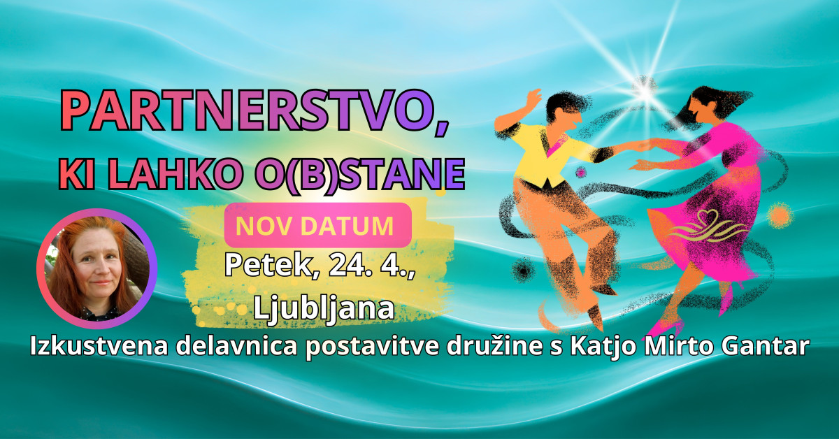 V petek, 24. 4., med 17. in predvidoma 21. uro (oziroma dlje, če bo potrebno) vabljeni na eksperimentalno izkustveno delavnico postavitve družine z naslovom Partnerstvo, ki lahko obstane.
