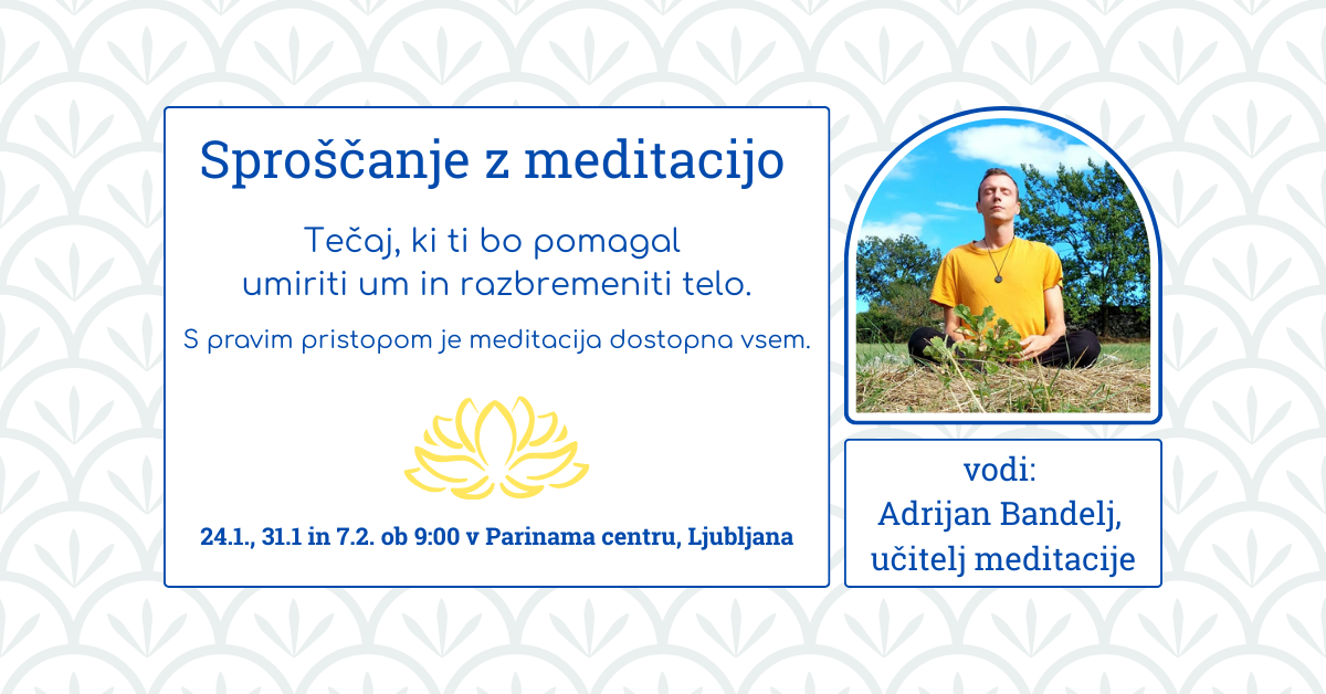 Meditacija je orodje za dosego notranjega miru, sproščanje stresa in boljšo povezavo s sabo, ki je dostopno vsem, ki se je lotijo s pravim pristopom. Da ti bo pričetek in vzdrževanje prijetne in učinkovite prakse kar se da enostaven, ponujam tečaj Sproščanje z meditacijo.