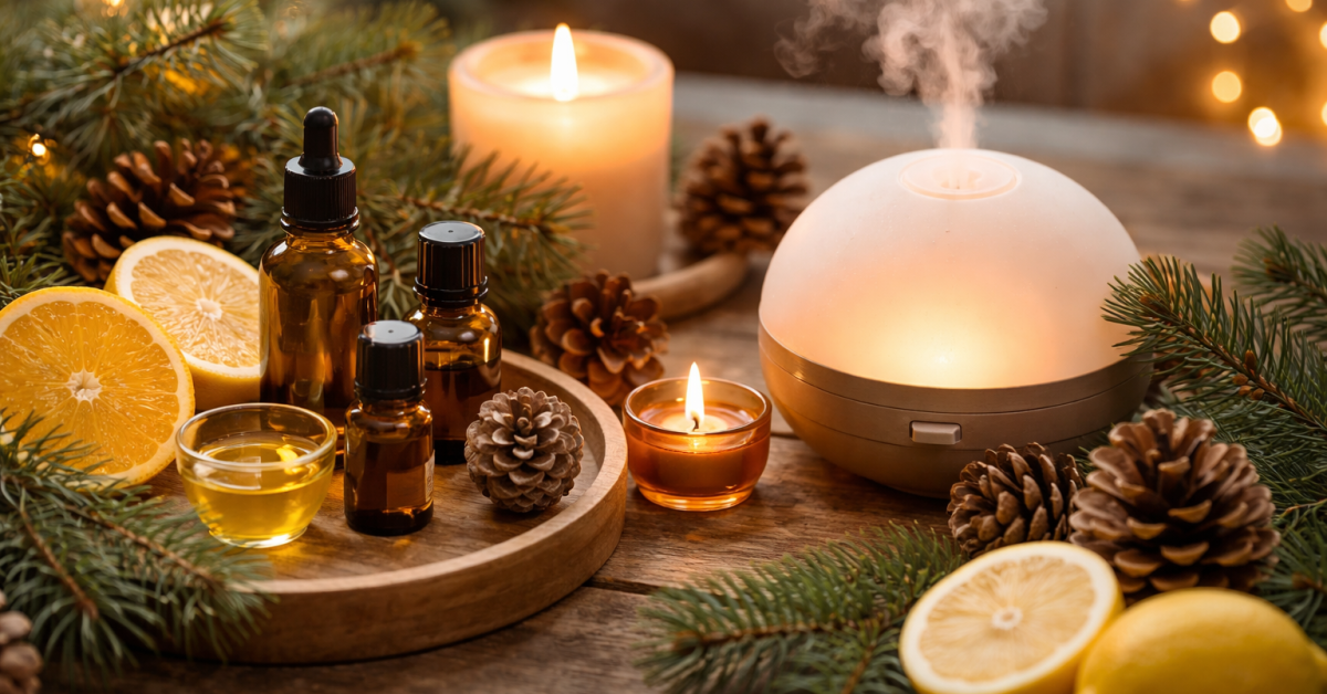 Pri aromaterapiji pozimi izbiramo olja, ki se ujemajo s temi potrebami. Pri dihalih se pogosto naslonimo na evkaliptus radiata, ravintsaro, iglavce (smreka, jelka, bor) in čajevec. Pri umirjanju in spancu so klasična izbira sivka, rimska kamilica, cedra, kadilo, pa tudi citrusi, ki pri mnogih ljudeh prinašajo občutek topline in srčne lahkotnosti. Za energijo in jasnost se pogosto uporabljajo limona, grenivka, rožmarin (odvisno od kemotipa) in v zelo majhnih količinah tudi poprova meta. Za toplino in mišično sprostitev pa so uporabna olja, ki so aromatično toplejša, kot so majaron, ingver, črni poper ali kombinacije sivke z nežnimi smolami.